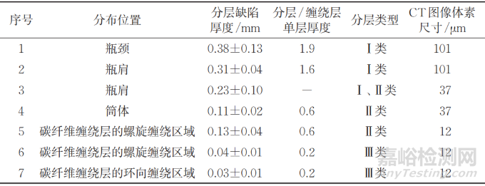 1.根據(jù)分層缺陷厚度,可將其分為厚度約為0.3,0.1,0.03 mm的缺陷。其中,厚度約為0.3 mm的分層缺陷主要存在于瓶頸和瓶肩,產(chǎn)生原因是鋁內(nèi)膽瓶頸處外表面存在凹面、瓶肩附近豎直方向上纏繞層的螺旋/環(huán)向纏繞方式不同導(dǎo)致了碳纖維纏繞層橋接;厚度約為0.1 mm的分層缺陷主要存在于瓶頸、瓶肩和筒體的螺旋纏繞區(qū)域內(nèi),產(chǎn)生原因是螺旋纏繞層纏繞不連續(xù);厚度約為0.03 mm的分層缺陷主要存在于纏繞層層間間隙處,產(chǎn)生原因可能是機(jī)加工過程中發(fā)生了纏繞層樹脂基體開裂。