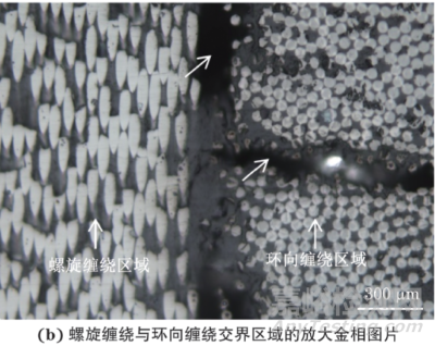 圖6a所示是螺旋和環(huán)向纏繞區(qū)域交界處的金相照片,螺旋纏繞區(qū)域和環(huán)向纏繞區(qū)域的單層纏繞層厚度分別為0.21±0.03 mm和0.16±0.03 mm,該測量結(jié)果與工業(yè)CT統(tǒng)計結(jié)果(分別為0.20±0.04 mm和0.17±0.03 mm)相一致,表明體素尺寸12 μm的工業(yè)CT圖像在測量纏繞層單層厚度時具有可靠的尺寸測量精度。