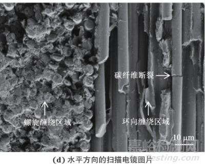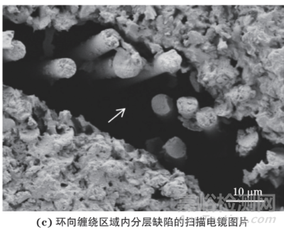 為進(jìn)一步驗(yàn)證工業(yè)CT和金相顯微鏡對纏繞層纏繞方式的判斷,使用掃描電鏡對碳纖維纏繞層試件的頂面(即平行于圖5e的外表面)進(jìn)行觀察,發(fā)現(xiàn)在螺旋和環(huán)向纏繞區(qū)域交界處右側(cè)存在近乎平行排布的環(huán)向纏繞碳纖維束。