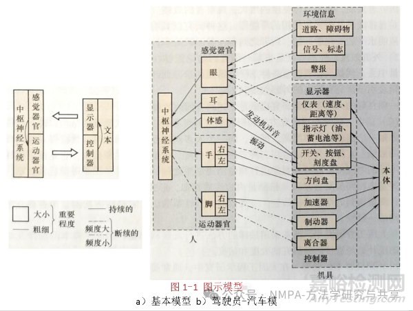 圖1-1a所示為三要素圖示模型形式;圖1-1b所示為駕駛員-汽車圖示模型示例。圖中方框的大小和要素之間連線的粗細(xì)均表示重要程度。通過這種圖示模型,可以清楚表明各個要素之間如何連接并構(gòu)成系統(tǒng)的。