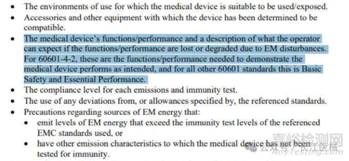 在FDA于2022年6月發(fā)布的醫(yī)療器械電磁兼容性指南中,明確要求制造商需要通過IEC TR 60601-4-2標準的要求對設備功能(performance,注意區(qū)別于基本性能)進行驗證和說明(見下圖)。