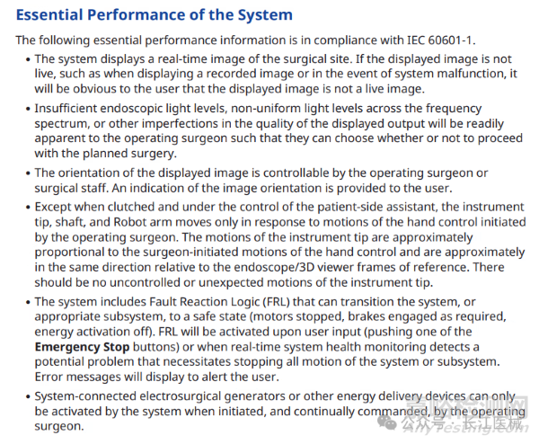 可以看出,達芬奇手術機器人的基本性能和標準要求相近,我大致歸納了一下,這些性能涵蓋了圖像性能,光源性能,圖像指示性能,運動控制性能,主從一致性能,安全控制性能以及電外科設備控制性能這幾大部分。這些性能的確定也符合IEC 60601-1對于基本性能的定義(既與臨床相關的重要性能)。