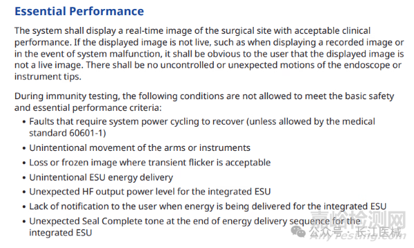 查閱FDA指南醫(yī)療器械的電磁兼容性(EMC)的D章節(jié),其中明確要求應聲明器械的基本性能(Essential Performance)。那么看來達芬奇的使用說明書中在EMC這部分章節(jié)里描述的基本性能(也就是第二段Essential Performance),才是有關抗擾度測試的判據(jù)。