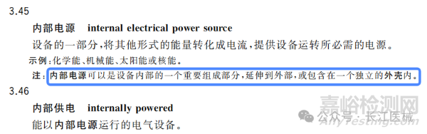 在GB 9706.1-2020中6.2對電擊防護(hù)中,將所有ME設(shè)備(醫(yī)用電氣設(shè)備)分為了Ⅰ類ME設(shè)備,Ⅱ類ME設(shè)備和內(nèi)部電源ME設(shè)備。下圖為標(biāo)準(zhǔn)中對內(nèi)部電源和內(nèi)部供電的術(shù)語解釋。其中注意藍(lán)色方框中的注解,也就是說對于電池/電源不在設(shè)備內(nèi)部的設(shè)備,也可以叫做內(nèi)部電源設(shè)備。
