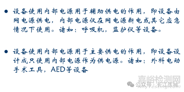 有一類內(nèi)部電源設(shè)備,他們存在由網(wǎng)電源連接供電的情況。這時(shí)設(shè)備的防電擊類型的分類是Ⅰ類/Ⅱ類ME設(shè)備和內(nèi)部電源ME設(shè)備。當(dāng)與供電網(wǎng)連接時(shí)應(yīng)滿足Ⅰ類/Ⅱ類ME設(shè)備的安規(guī)要求,不與供電網(wǎng)連接時(shí)滿足內(nèi)部電源ME設(shè)備的安規(guī)要求。