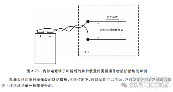 如果在內(nèi)部電源輸出和相應(yīng)的保護(hù)裝置之間的區(qū)域提供兩重對操作者的防護(hù)措施(注意爬電距離,2MOOP),那么可以不進(jìn)行內(nèi)部電源正極和負(fù)極的短路試驗(yàn)。否則,短路試驗(yàn)不應(yīng)導(dǎo)致13.1.2的任何危險(xiǎn)情況。