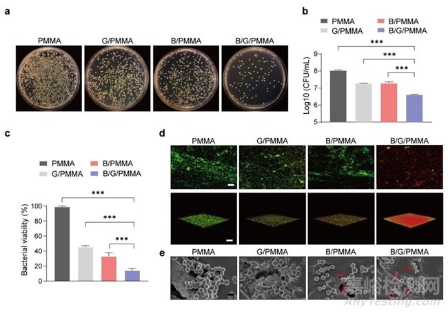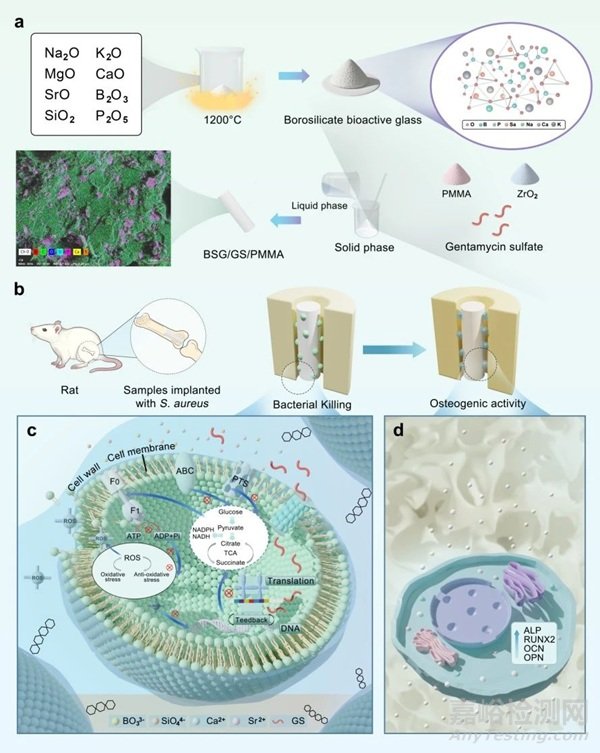 圖1.(a)硼硅酸鹽生物活性玻璃和生物活性抗菌骨水泥的制備。EDS成像圖像顯示BSG在PMMA內(nèi)均勻分布。(b)將生物活性抗菌骨水泥植入感染性股骨髓腔實(shí)現(xiàn)抗菌與促成骨示意圖。(c)生物活性抗菌水泥的抗菌機(jī)制。(d)生物活性抗菌骨水泥的成骨效應(yīng)示意圖。