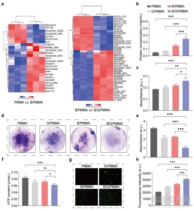 圖 4. 火山圖顯示PMMA和B/PMMA組(a)間以及B/PMMA和B/G/PMMA組(B)之間的基因表達(dá)差異。(c)差異表達(dá)基因的維恩圖。(d)通過(guò)基因集富集分析(GSEA)分析PMMA和B/PMMA組之間金黃色葡萄球菌的跨膜轉(zhuǎn)運(yùn)、離子轉(zhuǎn)運(yùn)、膜組成部分和跨膜轉(zhuǎn)運(yùn)蛋白活性。(e)使用京都基因和基因組百科全書(shū)(KEGG)分析比較PMMA和B/PMMA組之間金黃色葡萄球菌的上調(diào)基因和(f)下調(diào)基因。(g)使用KEGG分析比較B/PMMA和B/g/PMMA組之間金黃色葡萄球菌的上調(diào)基因和(h)下調(diào)基因。(i-k)蛋白質(zhì)相互作用(PPI)網(wǎng)絡(luò)圖顯示的生物過(guò)程間聯(lián)系。