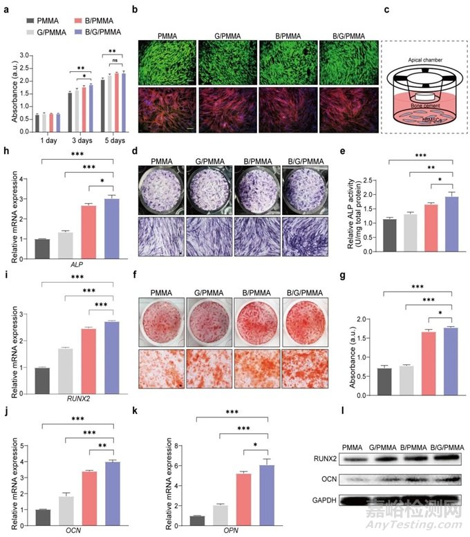 圖6.(a)共培養(yǎng)1天、3天和5天后hBMSCs的細(xì)胞毒性和增殖。(b)在24小時(shí)后hBMSCs的活/死(比例尺=200μm)和細(xì)胞骨架染色(比例尺=50μm)。(c)共培養(yǎng)模式示意圖。(d)hBMSCs的堿性磷酸酶(ALP)染色,比例尺=50μm。(e)培養(yǎng)7天后細(xì)胞培養(yǎng)基中ALP定量分析。(f)共培養(yǎng)14天后,hBMSCs的茜素紅S(ARS)染色,比例尺=50μm。(g)hBMSCs的ARS染色定量分析。在共培養(yǎng)7天后的(h)堿性磷酸酶(ALP)和(i)runt相關(guān)轉(zhuǎn)錄因子2(RUNX2)基因表達(dá)。(j)在共培養(yǎng)14天后的骨鈣素(OCN)和骨橋蛋白(OPN)基因表達(dá)。(l)在共培養(yǎng)7天和14天后hBMSCs的RUNX2和OCN蛋白表達(dá)。