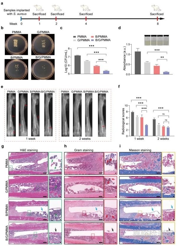 圖7.(a)體內(nèi)實(shí)驗(yàn)設(shè)計(jì)。(b)植入后1周瓊脂平板法下菌落形成。(c)瓊脂平板法菌落定量分析。(d)使用細(xì)菌培養(yǎng)法(OD=600nm)評(píng)估植入后1周抗菌效果。(e)植入1周和2周后金黃色葡萄球菌感染的大鼠股骨病變X射線照片。(f)X射線評(píng)分直方圖。(g)植入2周后的蘇木精-伊紅(H&E)染色、(H)革蘭氏染色和(i)Masson染色。