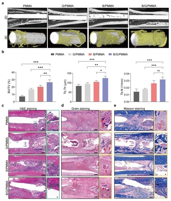為進(jìn)一步檢測(cè)所構(gòu)建生物活性抗菌水泥對(duì)植入物相關(guān)金葡菌骨感染的治療效果,本研究通過(guò)構(gòu)建植入物相關(guān)金葡菌骨感染模型,并植入不同性質(zhì)的植入物進(jìn)行治療,待感染形成1周和2周后,單純PMMA組實(shí)驗(yàn)動(dòng)物金葡菌感染性股骨髓腔內(nèi)可見(jiàn)大量菌落。與負(fù)載GS的PMMA水泥相比,摻入BSG的生物活性抗菌水泥治療組顯示出優(yōu)異抗菌活性。X射線顯示,PMMA骨水泥組表現(xiàn)出明顯骨感染和骨膜反應(yīng),而B(niǎo)/G/PMMA組僅顯示出輕微骨膜反應(yīng)。組織學(xué)H&E染色顯示,除B/G/PMMA組外,PMMA、G/PMMA和B/PMMA組髓腔內(nèi)有大量炎性細(xì)胞浸潤(rùn),革蘭氏染色進(jìn)一步證實(shí),PMMA、G/PMMA和B/PMMA組可見(jiàn)大量金黃色葡萄球菌定植于骨細(xì)胞腔隙小管網(wǎng)絡(luò)(OLCN)和髓腔內(nèi)感染性死骨中。Masson染色證明,B/G/PMMA植入物周圍大量膠原蛋白形成。上述綜合證明,生物活性抗菌水泥具有優(yōu)異的抗菌作用,可清除定植在骨小管和死骨中金黃色葡萄球菌。植入后4周和8周,Micro-CT結(jié)果顯示,B/PMMA和B/G/PMMA植入物周圍的新骨形成明顯,形成殼結(jié)構(gòu)。G/PMMA骨水泥植入物周圍只觀察到一定量的松散和無(wú)定形骨組織,骨參數(shù)分析顯示,B/G/PMMA組新生骨量最高。