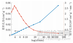 圖2 −20℃冷凍溫度制備質(zhì)量分?jǐn)?shù)0.3%PI納米纖維氣凝膠的孔徑分布