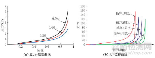 圖 3 − 20 ℃ 冷凍溫度制備不同 PI 納米纖維質(zhì)量分?jǐn)?shù)氣凝膠的應(yīng)力-應(yīng)變曲線和質(zhì)量分?jǐn)?shù) 0.3%PI 納米纖維氣凝膠在循環(huán)加載下的力-位移曲線