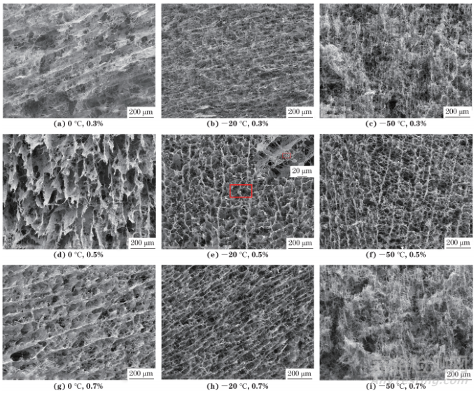 圖 1 不同冷凍溫度制備不同PI納米纖維質(zhì)量分?jǐn)?shù)氣凝膠的微觀形貌