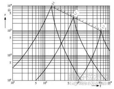 圖 2是普通電感線圈的阻抗與頻率的關(guān)系圖,由圖中可以看出,電感線圈的阻抗開始的時候是隨著頻率升高而增大的,但當它的阻抗增大到最大值以后,阻抗反而隨著 頻率升高而迅速下降,這是因為并聯(lián)分布電容的作用。當阻抗增到最大值的地方,就是電感線圈的分布電容與等效電感產(chǎn)生并聯(lián)諧振的地方。圖中,L1 > L2 > L3,由此可知電感線圈的電感量越大,其諧振頻率就越低。從圖2中可以看出,如果要對頻率為1MHZ的干擾信號進行抑制,選用L1倒不如選用L3,因為 L3的電感量要比L1小十幾倍,因此L3的成本也要比L1低很多。