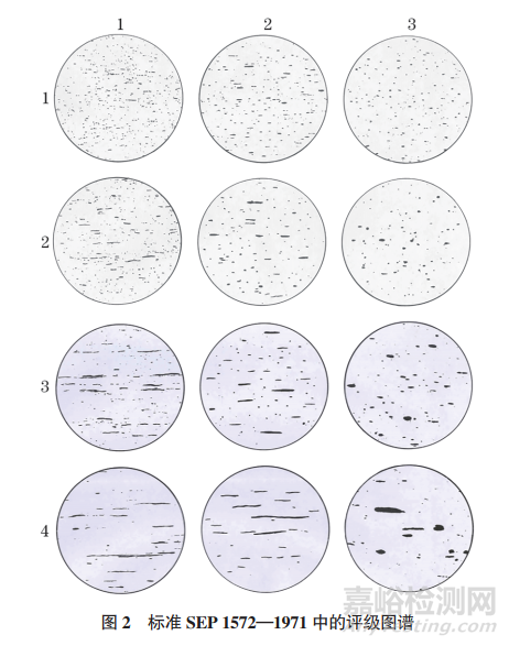 標(biāo)準(zhǔn)SEP 1572兩個(gè)版本均采用了比較法和圖像儀法來評(píng)價(jià)硫化物夾雜物,其中比較法是對(duì)整個(gè)視場(chǎng)進(jìn)行評(píng)級(jí),而不對(duì)單個(gè)硫化物夾雜物顆粒進(jìn)行評(píng)級(jí);圖像儀法是先評(píng)定單視場(chǎng)中每個(gè)硫化物夾雜物顆粒的級(jí)別,然后以占單視場(chǎng)中面積最大原則評(píng)定單視場(chǎng)的硫化物級(jí)別,最后以占優(yōu)勢(shì)視場(chǎng)數(shù)目的夾雜物級(jí)別作為試樣硫化物夾雜物的級(jí)別。
