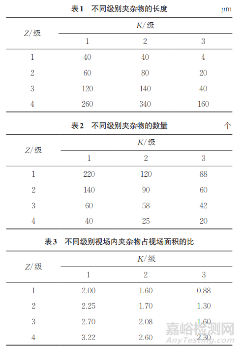 根據(jù)標(biāo)準(zhǔn)SEP 1572—1971,對(duì)各級(jí)夾雜物進(jìn)行統(tǒng)計(jì),結(jié)果如表1~3所示。由表1~3可知:隨著Z級(jí)別增大,視場(chǎng)內(nèi)夾雜物的長(zhǎng)度增大,夾雜物數(shù)量逐漸變少,視場(chǎng)內(nèi)夾雜物占視場(chǎng)面積的比逐漸增大;隨著K級(jí)別增大,視場(chǎng)內(nèi)夾雜物長(zhǎng)度減小,夾雜物寬度增大,夾雜物數(shù)量逐漸變少,視場(chǎng)內(nèi)夾雜物占視場(chǎng)面積的比逐漸減小,這種分布和評(píng)級(jí)圖中夾雜物的分布相近。