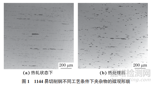 硫化物夾雜物的尺寸、分布、形態(tài)不同,對(duì)含硫易切削鋼切削性能的影響不同。目前,國(guó)內(nèi)通常根據(jù)GB/T 10561—2023《鋼中非金屬夾雜物含量的測(cè)定 標(biāo)準(zhǔn)評(píng)級(jí)圖顯微檢驗(yàn)法》來評(píng)定易切削鋼中的硫化物夾雜物,但易切削鋼中硫化物夾雜物的數(shù)量較多,單視場(chǎng)內(nèi)硫化物夾雜物很長(zhǎng),幾乎每個(gè)易切削鋼試樣的硫化物夾雜物級(jí)別均大于4 級(jí),因此無法通過對(duì)硫化物夾雜物進(jìn)行評(píng)級(jí)來反映夾雜物分布和形態(tài)的差別。圖1為1144易切削鋼中硫化物夾雜物的微觀形貌。為研究其切削性能,對(duì)夾雜物形態(tài)進(jìn)行改變,在熱軋狀態(tài)下,硫化物夾雜物較細(xì)長(zhǎng);熱處理后,硫化物夾雜物變得短粗。熱處理工藝為:將試樣加熱至1200℃,保溫30min后,緩冷。根據(jù)GB/T 10561—2023,圖1(a)和1(b)中夾雜物級(jí)別均大于4級(jí)。雖然肉眼可見夾雜物的尺寸、形態(tài)已經(jīng)發(fā)生變化,但無法反映工藝前后夾雜物級(jí)別的差異。