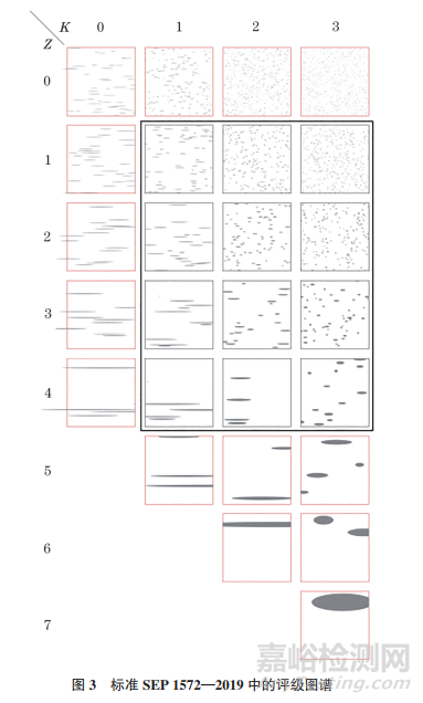 標(biāo)準(zhǔn)SEP 1572—2019中的比較法規(guī)定,單視場(chǎng)的尺寸為710μm×710μm(邊長(zhǎng)×邊長(zhǎng)),采用網(wǎng)格模式逐個(gè)視場(chǎng)掃描檢測(cè)面。對(duì)于每個(gè)視場(chǎng),記錄與標(biāo)準(zhǔn)圖譜最接近的圖像。長(zhǎng)度大于710μm 的顆粒標(biāo)注為超大顆粒。比較法無法提供除級(jí)別以外的其他硫化物夾雜物參數(shù),如夾雜物的長(zhǎng)度、寬度等。試樣評(píng)級(jí)結(jié)果是根據(jù)檢測(cè)面內(nèi)占優(yōu)勢(shì)視場(chǎng)的硫化物夾雜物級(jí)別決定的。相比標(biāo)準(zhǔn)SEP 1572—1971,標(biāo)準(zhǔn)SEP 1572—2019的評(píng)級(jí)圖譜有很大改變:新版圖譜以一定算法通過軟件形式生成,硫化物夾雜物均為模擬圖像;圖譜數(shù)量從原來的12 張變?yōu)?6張,其K級(jí)別和Z級(jí)別也相應(yīng)進(jìn)行了擴(kuò)展,K從1~3級(jí)增加為0~3級(jí),Z從1~4級(jí)增加為0~7級(jí)(見圖3),可評(píng)定的夾雜物形貌更豐富。