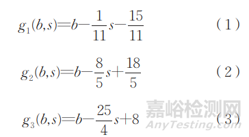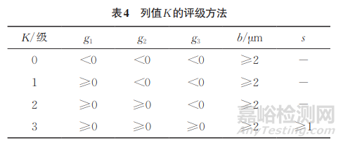標(biāo)準(zhǔn)SEP 1572—2019中的圖像儀法主要是通過公式計(jì)算劃分了K和Z。標(biāo)準(zhǔn)SEP 1572—2019中圖像儀法可評(píng)定長(zhǎng)度不小于3μm,寬度不小于2μm的夾雜物。評(píng)定方法為:首先測(cè)量視場(chǎng)內(nèi)各夾雜物的長(zhǎng)度l、寬度b、長(zhǎng)寬比s;將b、s分別代入式(1)~(3),根據(jù)表4計(jì)算g1、g2、g3,依次得出夾雜物的列值K。