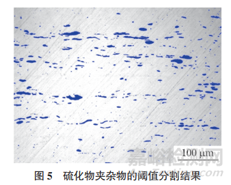 采用圖像儀法對(duì)硫化物夾雜物級(jí)別進(jìn)行評(píng)定。首先對(duì)圖4進(jìn)行閾值分割,分割時(shí)選取合適的閾值,盡量使每個(gè)夾雜物都能選取上,結(jié)果如圖5所示。用金相軟件測(cè)量視場(chǎng)內(nèi)各夾雜物的長(zhǎng)度、寬度、面積、長(zhǎng)寬比;去除寬度小于2μm的夾雜物,將測(cè)量數(shù)據(jù)代入式(1)~(3)中,得出每個(gè)夾雜物的K級(jí)別;當(dāng)K為3級(jí)時(shí),將長(zhǎng)寬比小于1的夾雜物也排除。