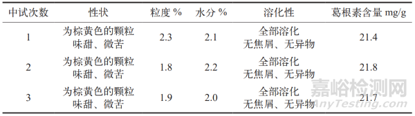 經(jīng)過對 3 次中試制備的顆粒進(jìn)行綜合檢驗(yàn),結(jié)果表明顆粒的性狀、粒度、水分含量、溶化性能以及顆粒鑒別檢查和葛根素含量等各項(xiàng)指標(biāo)均符合既定標(biāo)準(zhǔn)。檢驗(yàn)數(shù)據(jù)之間具有較高的一致性,顯示出良好的重現(xiàn)性。