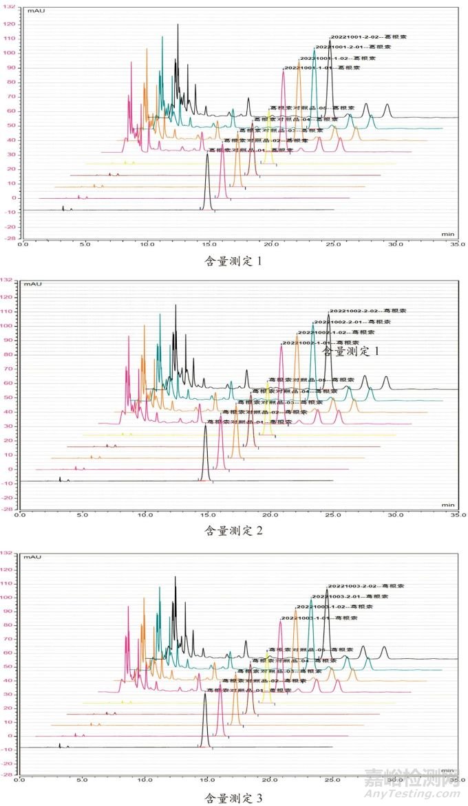 顆粒的鑒別檢查結(jié)果均符合規(guī)定,鑒別檢查圖譜詳見圖 1。顆粒的性狀、葛根素含量等詳細(xì)檢查結(jié)果見表 5,葛根素含量檢查圖譜見圖 2。