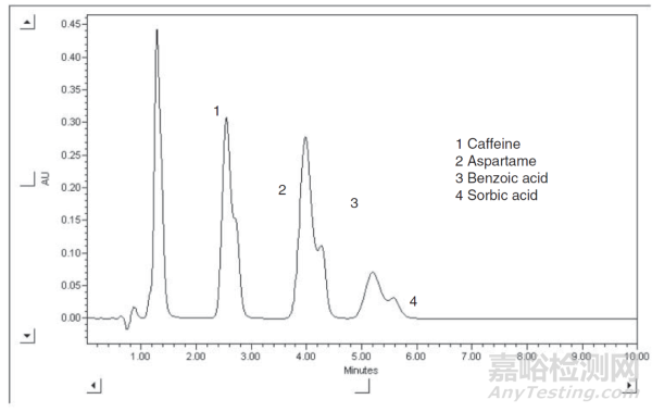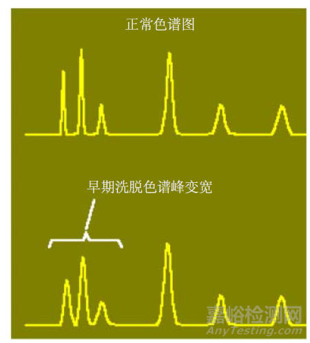 可通過反向沖洗色譜柱、在色譜柱入口處重新填充填料或更換色譜柱(現(xiàn)在更常見的方法是更換色譜柱)來解決這些問題。請注意,早期洗脫峰的色譜峰比預期的要寬,這通常是由于高效液相色譜系統(tǒng)的柱外譜帶展寬造成的(圖 3)。對于小內徑的超高效液相色譜柱而言,這些柱外展寬效應尤其有害。