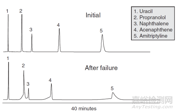 圖 2. 因暴露于高 pH 值流動相而導致:性能良好的 C18 硅膠色譜柱和性能不佳的 C18 硅膠色譜柱的色譜圖對比。