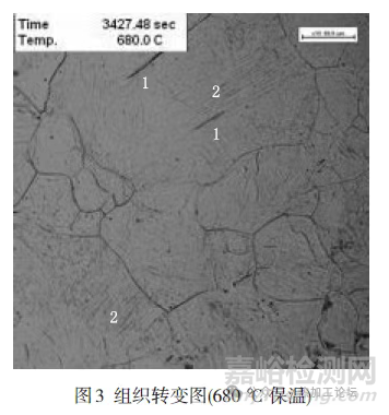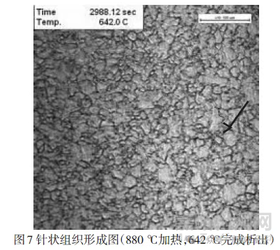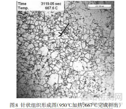 從連續(xù)冷卻試驗(yàn)可知:從較低加熱溫度880℃連續(xù)冷卻,在649℃開始析出針狀組織,至642℃析出完成;從較高加熱溫度950℃連續(xù)冷卻,在675℃開始析出,至667℃完成析出;從高的加熱溫度1020℃連續(xù)冷卻,在680℃開始析出,至658℃完成析出,析出的針狀組織較多,且針大多很粗長,如圖9中數(shù)字位置所示,針狀組織先后析出。所有加熱溫度下單個針完成析出用時約6s,高的加熱溫度下,全部針最后完成析出用時22s。