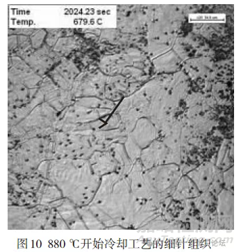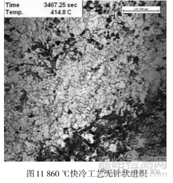從冷卻速度試驗(yàn)可知:880℃以上,即使冷卻速度降到極低,也有針狀組織形成,冷速越大,形成的針狀組織越多,見圖10。860℃以下,即使冷卻速度升到很高(低于淬火冷速),也沒有針狀組織形成,見圖11。