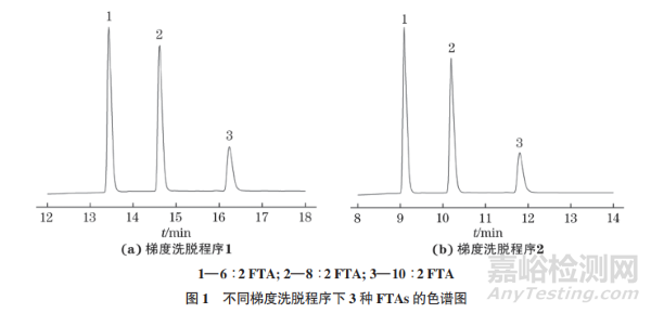 以乙腈-水體系為流動相,對目標化合物的梯度洗脫程序進行優(yōu)化。當流動相B為30%且在5.0min內(nèi)由30%升至50%,再在5.0~10.0min內(nèi)由50%升至 80%并保持15.0min,繼而在25.0~30.0min內(nèi)由80%降至30%(梯度洗脫程序1)時,3種目標化合物的分離效果較好但出峰時間較晚,集中在13.4~16.3min內(nèi),如圖1(a)所示;進一步調(diào)節(jié)流動相的比例和洗脫時間等來縮短出峰時間,將有機相的初始比例提升至50%并保持2.0min,并在3.0min 內(nèi)緩慢升至80%并保持7.0min,繼而在0.5min內(nèi)由80%迅速降至50%并保持2.5min(梯度洗脫程序2),此時3種目標化合物分別在9.06,10.16,11.82 min處出峰 [圖1(b)],出峰時間早,峰形較窄且對稱,分離度好。結(jié)合3種FTAs的結(jié)構(gòu),發(fā)現(xiàn)隨著碳鏈的延長,F(xiàn)TAs在色譜柱中的保留時間越長,出峰也越晚,這與全氟類化合物的極性有關(guān),碳鏈的增長致使分子極性逐步降低,進而增強了其與色譜柱中非極性填料的相互作用(C18固定相的豎直排列的碳鏈與目標化合物的碳鏈間形成空間匹配的“選擇性分子間作用力”),導(dǎo)致保留時間延長。綜合考慮3種FTAs的極性和出峰時間,試驗選擇梯度洗脫程序2分離 3種目標化合物。
