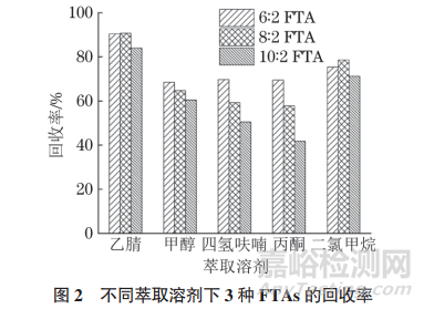FTAs溶于多種有機溶劑,試驗考察了乙腈、甲醇、丙酮、四氫呋喃和二氯甲烷等5種萃取溶劑對目標化合物萃取效率的影響,結(jié)果如圖2所示。
