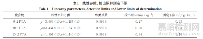 由表1可知,3種FTAs的檢出限為0.27~0.34mg·kg−1。