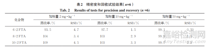 選用不含目標化合物的樣品作為空白基質(zhì),分別加入低、中、高等3個濃度水平 (2,10,50mg·kg−1) 的目標化合物,按照試驗條件進行測定,每個濃度水平平行測定6次,計算回收率和測定值的相對標準偏差(RSD),結(jié)果見表2。