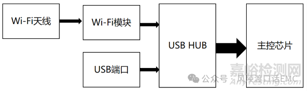 靜電放電過程中出現(xiàn)Wi-Fi掉線,系統(tǒng)工作正常,則明問題主要來自Wi-Fi模塊電路。根據(jù)產(chǎn)品電路設計框圖可知,Wi-Fi模組輸出USB差分信號到USB Hub芯片轉換,再輸出給主控芯片處理,其中Wi-Fi模組與主控芯片之間通過多個GPIO信號控制。