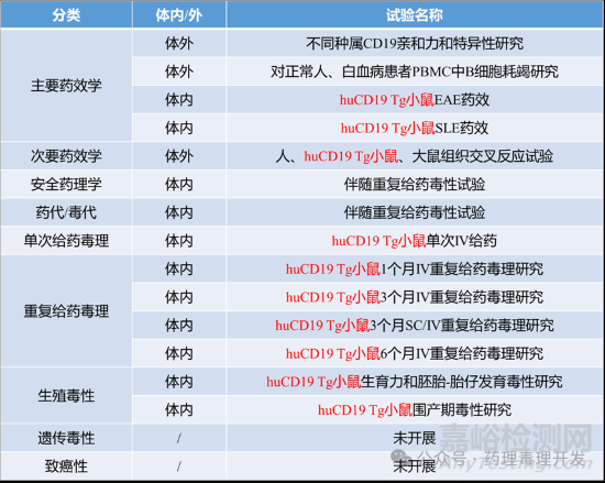 Inebilizumab-cdon非臨床藥理毒理研究內(nèi)容如下表所示: