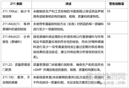 前五缺陷項引用條款與往年相似,21 CFR 211.100(a) 節(jié)再次名列榜首。此外FDA繼續(xù)專注于原輔料檢驗,因為各種污染物已經(jīng)滲透到非處方藥領域,特別是在洗手液和其他外用產(chǎn)品中。