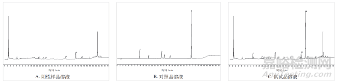 精密吸取上述陰性樣品溶液、對(duì)照品溶液及供試品溶液,按“2.1”項(xiàng)下的色譜條件進(jìn)樣,記錄色譜圖,見(jiàn)圖1。結(jié)果顯示,各成分有效分離且陰性對(duì)照無(wú)干擾,表明該方法專屬性良好。