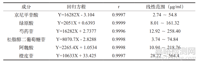 將對(duì)照品稀釋成 6 個(gè)不同濃度,分別取 5 μl,按“2.1”項(xiàng)下色譜條件進(jìn)樣測(cè)定。以C質(zhì)量濃度為橫坐標(biāo)(X, mg/ml)、S 峰面積為縱坐標(biāo)(Y),進(jìn)行回歸分析,結(jié)果見(jiàn)表1。各成分在各自范圍內(nèi)線性關(guān)系良好。