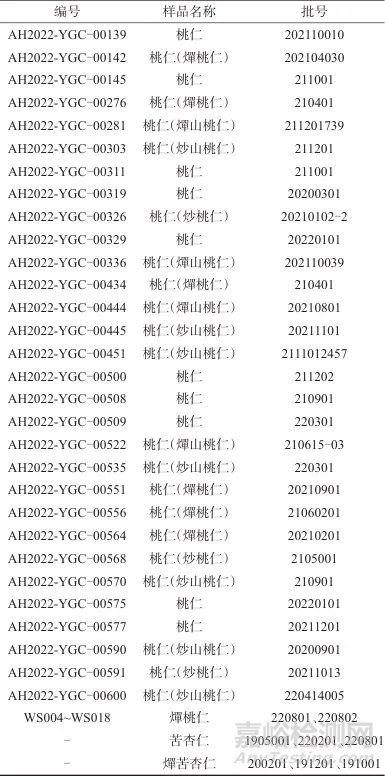 實(shí)驗(yàn)樣品:桃仁及其炮制品共計(jì)30個(gè)批次,炮制工藝的燀桃仁共計(jì)30個(gè)批次,苦杏仁共計(jì)6個(gè)批次,均由安徽省食品藥品檢驗(yàn)研究院提供并鑒別,具體信息見表1。