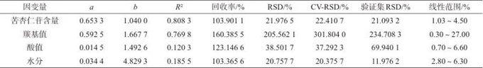 采用PLSR偏最小二乘回歸分析方法同時(shí)對(duì)桃仁樣品中的苦杏仁苷含量、水分、羰基值、酸值4個(gè)指標(biāo)進(jìn)行分析,統(tǒng)計(jì)結(jié)果見表4。