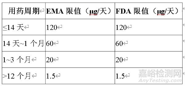 表1 EMA與FDA對基因毒性雜質(zhì)的階段性控制標準