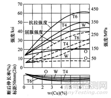 圖3 高純度變形鋁-銅合金的拉伸性能注:薄板試樣寬13mm(0.5in)寬,厚1.59mm(0.06in)。0-退火;W-固溶水淬后立即測(cè)試;T4-固溶水淬后,在室溫下時(shí)效;T6-在 T4后高溫時(shí)效。
