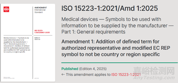 2025年3月,國際標(biāo)準(zhǔn)化組織(ISO)更新了ISO 15223-1:2021/Amd 1:2025。本標(biāo)準(zhǔn)描述了醫(yī)療器械符號的使用。