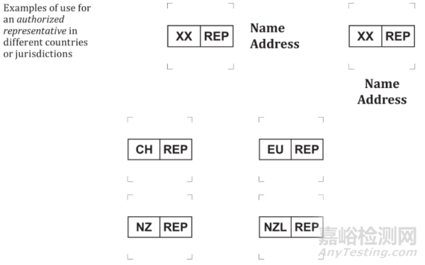 如果多個(gè)符號(即授權(quán)代表、進(jìn)口商、分銷商等)標(biāo)識了同一責(zé)任實(shí)體,則名稱和地址無需重復(fù),所有適用的符號可以在單個(gè)地址旁邊組合在一起。