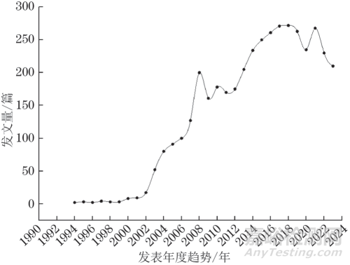 基于中國知網(wǎng)、Web of Science等文獻(xiàn)資源庫,以“管道泄漏”、“檢測定位”、“定位方法”等為關(guān)鍵詞檢索發(fā)表時(shí)間為1994年1月至2023年12月的文獻(xiàn),可得到近30年關(guān)于“管道泄漏檢測”的國內(nèi)外發(fā)文情況與研究現(xiàn)狀。