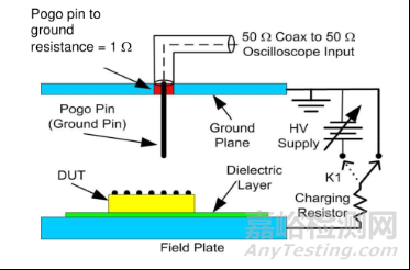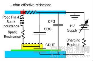 CDM測(cè)試裝置主要由一個(gè)與高壓電源相連的充電板Field Plate和一個(gè)接地的Pogo pin構(gòu)成,Pogo pin能夠在待測(cè)IC(DUT)的引腳間移動(dòng),以模擬實(shí)際的ESD事件。圖1展示了實(shí)際的測(cè)試模塊,而圖2則為等效電路圖,其中CDUT代表DUT與場(chǎng)板之間的電容,CDG代表DUT與地平面之間的電容,CFG代表場(chǎng)板與地平面之間的電容。