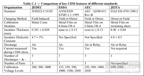 在CDM測(cè)試規(guī)范統(tǒng)一化之前,存在多個(gè)參考標(biāo)準(zhǔn),包括JESD22-C101、ESDA S5.3.1、AEC Q100-011和EIAJ ED-4701/300-2等,這些標(biāo)準(zhǔn)在校準(zhǔn)平臺(tái)、示波器帶寬和波形驗(yàn)證參數(shù)等方面存在差異。