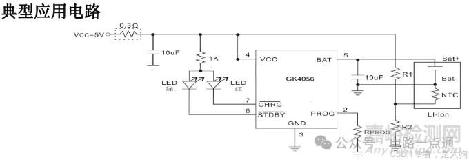 在芯片的數據手冊里面有提供經典電路圖,在這張經典電路圖里面兩個10UF電容分別用來給電路中的輸入電壓跟輸入電壓用來濾波,1k電阻用來給二極管限流降壓,Rprog電阻用來決定恒流模式下載充電電流,而R1 R2 還有NTC 電路是用來檢測電池溫度的。